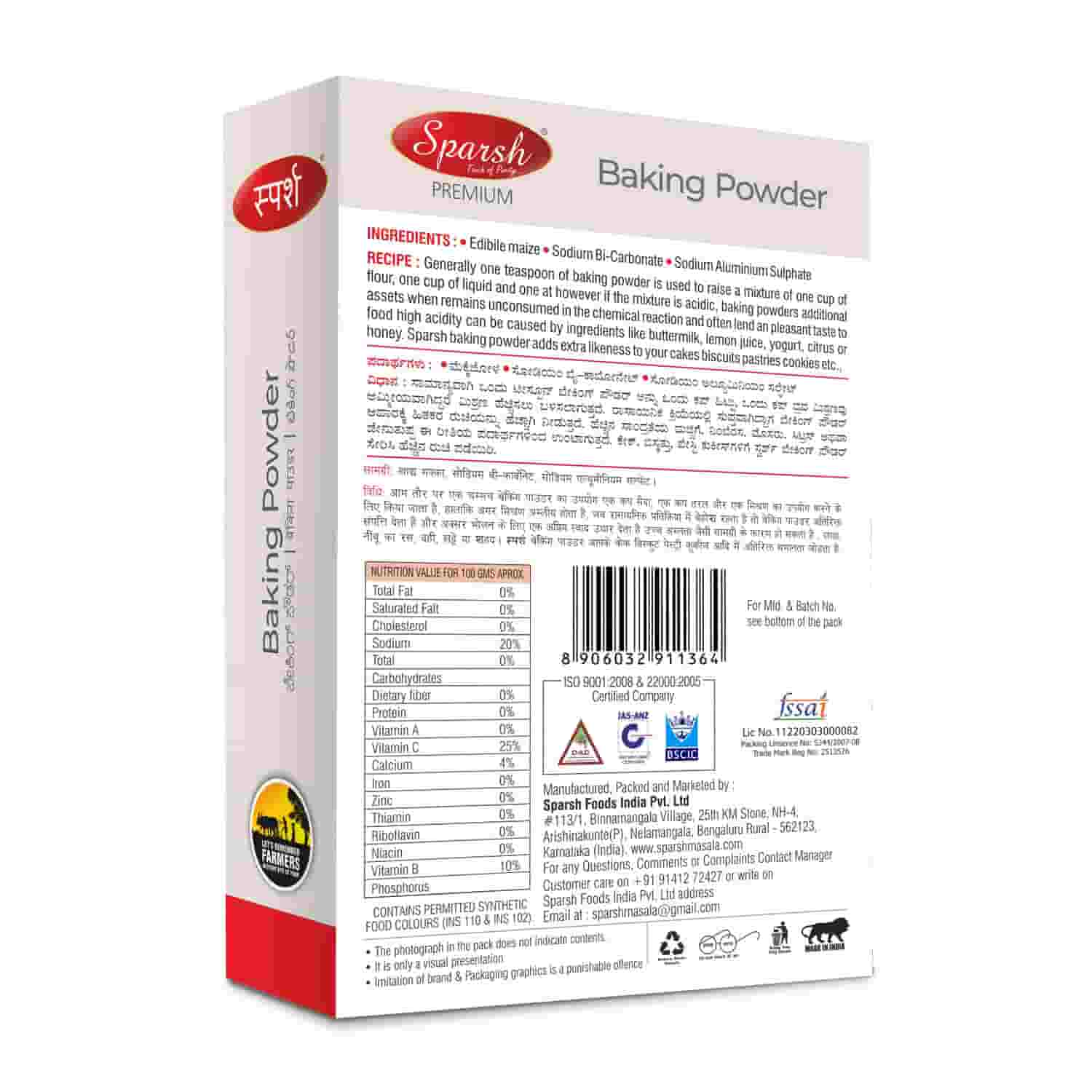 Unlike other Baking Soda, Sparsh Baking Powder is a complete chemical leavening agent. It contains a combination of Sodium Bicarbonate and an acid. Baking Powder is activated when it is combined with any liquid and is commonly used in give a rise in baked goods such as cakes. It activates a second time, when heat is applied.