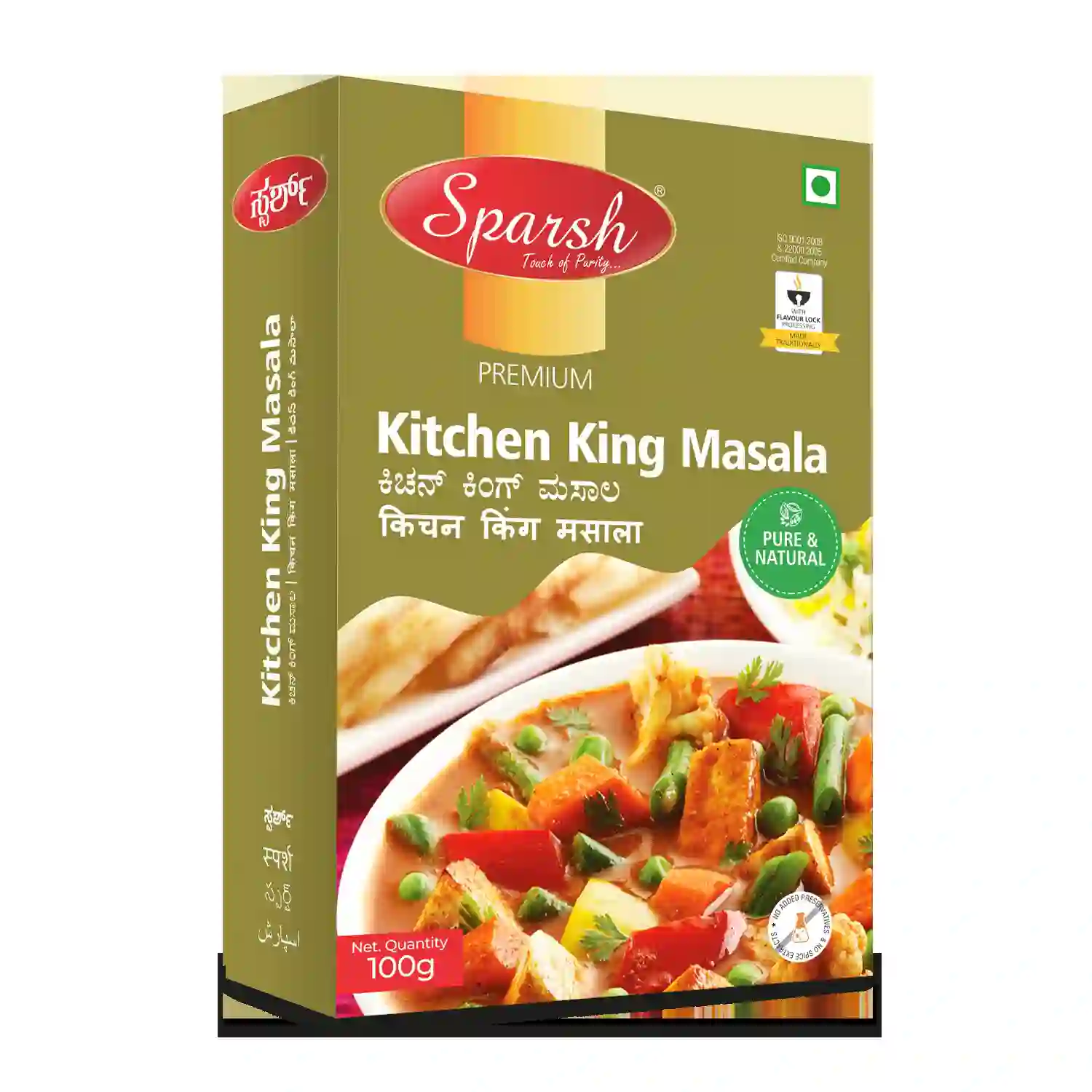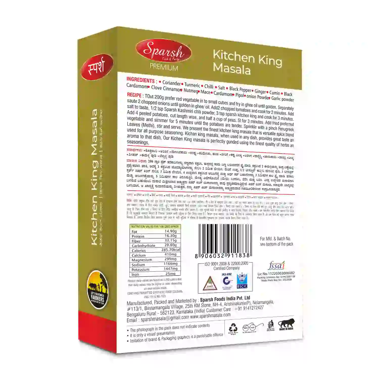 Sparsh Kitchen King Masala has the best ingredients which contain Coriander, cumin, turmeric, black pepper, garlic, dry ginger, mace, cardamom seed etc…