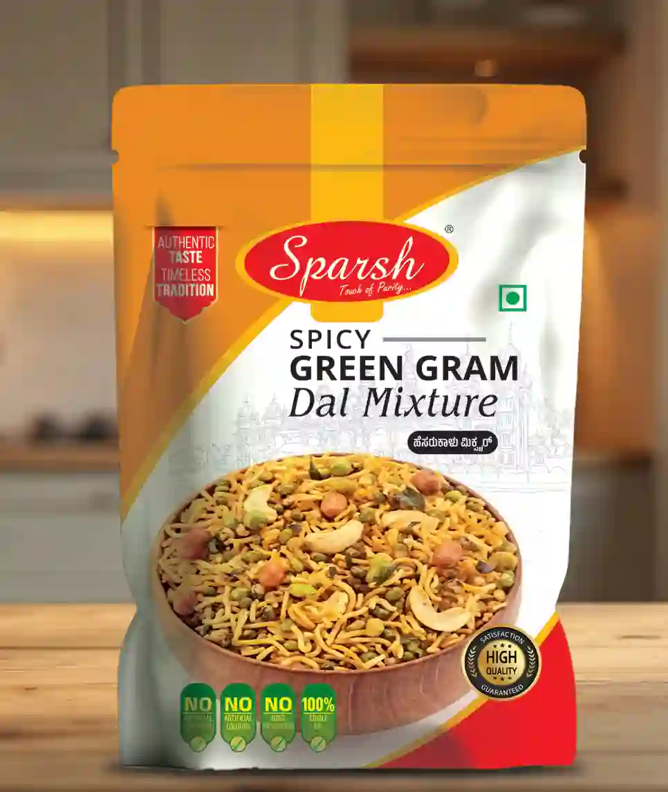 Sparsh Spicy Green Gram Dal Mixture is a crunchy savoury snack prepared using premium quality green gram dal and carefully selected Indian spices. Roasted to perfection and seasoned evenly, this mixture delivers a bold, satisfying taste with a rich crunchy texture.